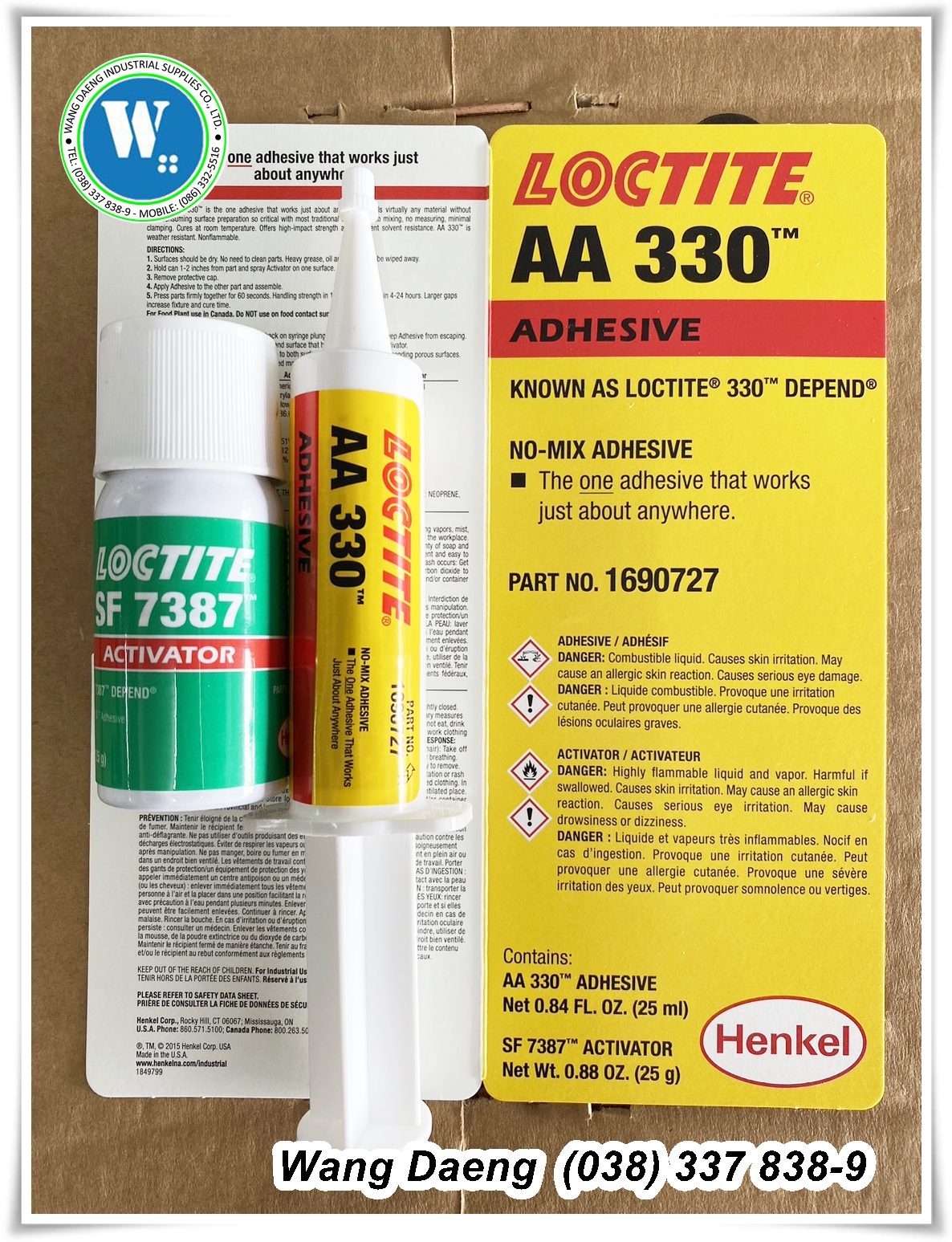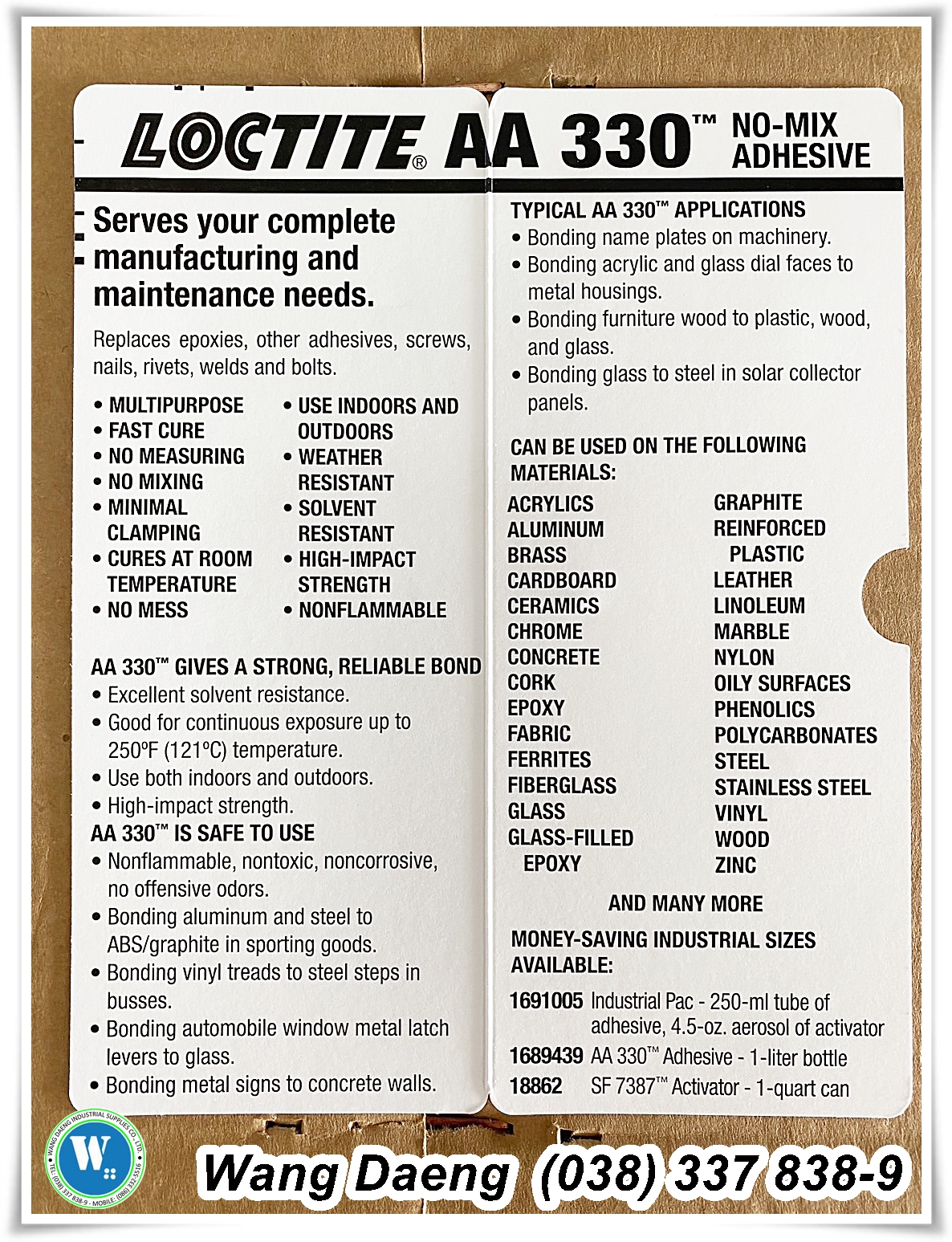 LOCTITE® AA 330 เป็นกาวอะคริลิค สำหรับใช้งานทั่วไป ใช้ได้ทันทีไม่ต้องการผสม สีเหลืองอ่อนเหมาะกับงานติดพื้นผิววัสดุที่แตกต่างกัน เช่น พีวีซี ฟีนอลิก และ อะคริลิคคอมปาวด์ เป็นผลิตภัณฑ์ที่มีความหนืดปานกลางถึงสูง ซึ่งมีความทนทานต่อแรงกระแทกได้ดี และมีอุณหภูมิใช้งานสูงถึง +100°C แนะนำให้ใช้ร่วมกับน้ำยาเร่งปฏิกิริยา LOCTITE® SF 7387